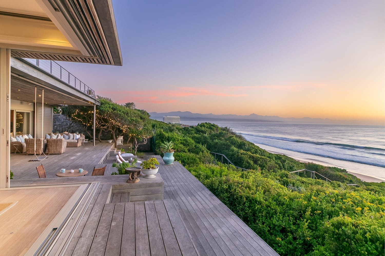 The expansive open-plan living areas capture the full splendor of the coastline through seamless glass walls, offering a breathtaking 180-degree panorama of the ocean, Robberg Peninsula, and the distant Tsitsikamma Mountains. Every detail is designed to celebrate the view—whether you’re lounging on the vast sea-facing deck, enjoying the rooftop garden, or unwinding in the jacuzzi beneath a canopy of milkwood trees as the stars shimmer overhead. A private path winds through indigenous fynbos, leading you directly to the soft golden sands of Robberg Beach.